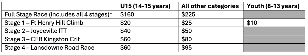 Registration will be through CCN bikes. Register for individual events or for the whole stage race. Only those who enter all 4 events are eligible for placing on the General Classification. Due to the event timing, stage race entrants who are unable to participate in the Fort Henry Hill Climb will be assigned the same time as the last place finisher and counted in the stage race General Classification.